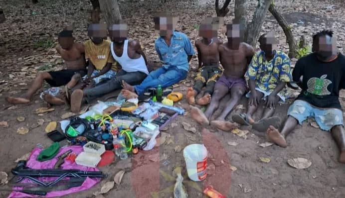 According to a military press release, eight suspects were initially apprehended in the clearance raid. Items recovered from them included a pump-action gun, a locally made pistol, live cartridges, a POS machine, illicit drugs suspected to be cannabis, tramadol, and codeine syrup, as well as phones, a camera, and ₦87,550 in cash.