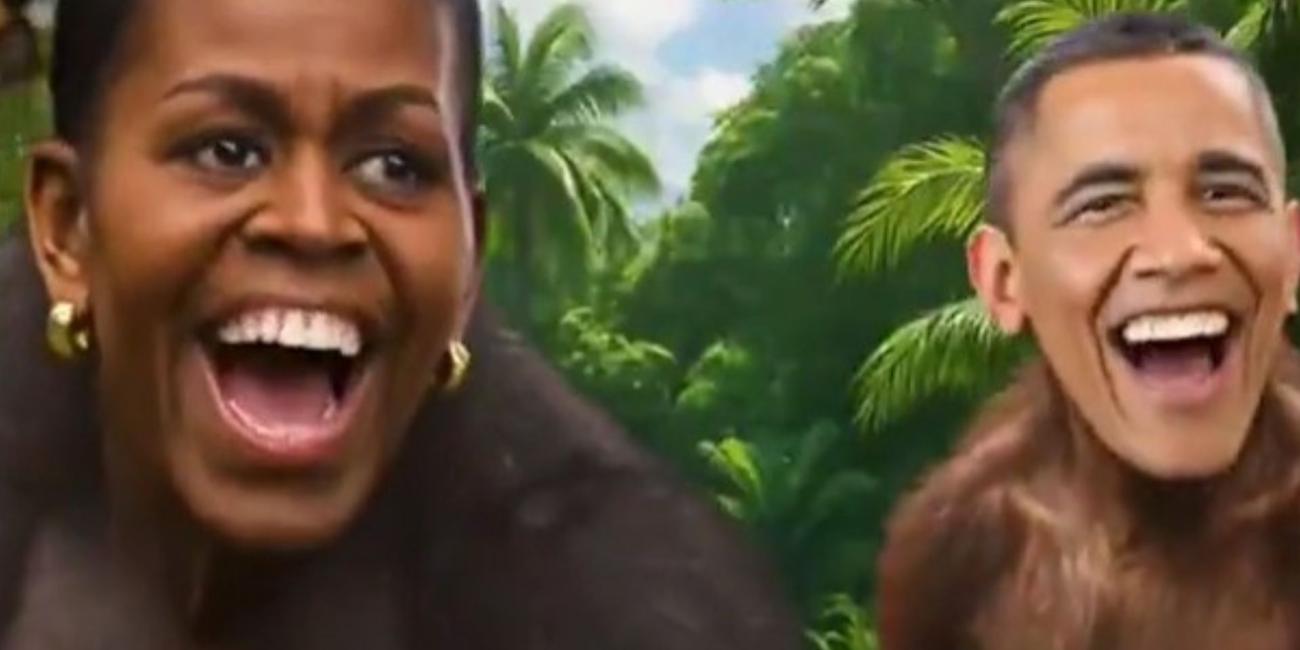 Close to the one-minute point of the footage, an altered segment appears. It shows the Obamas’ faces placed on monkeys’ bodies. The background audio features the song ‘The Lion Sleeps Tonight’.